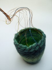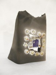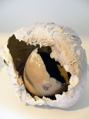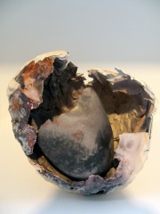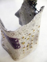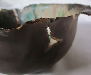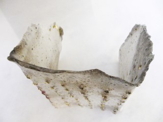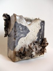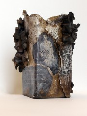 I work with the texture and body of the material, not forcing it to be something it is not. I am fascinated by flaws that express themselves through the clay body. There is a strong emphasis on texture and how tactile an object is; even if you are not supposed to, or able to touch it, the object you see should invite touch, it should ignite curiosity and thought. Accentuating the cracks, crazing, and crawling is achieved by experimenting with the finishings, using inclusion of organic matter to expose textures and imperfections present within the materials. Using low-temperature firings maintains porosity and openness of the body, and enables me to add another layer of depth by smoke firing work.